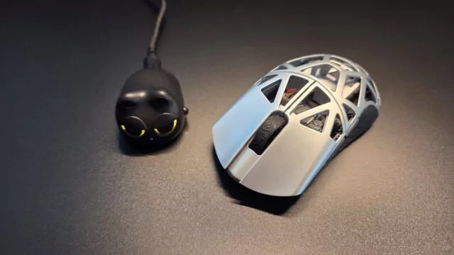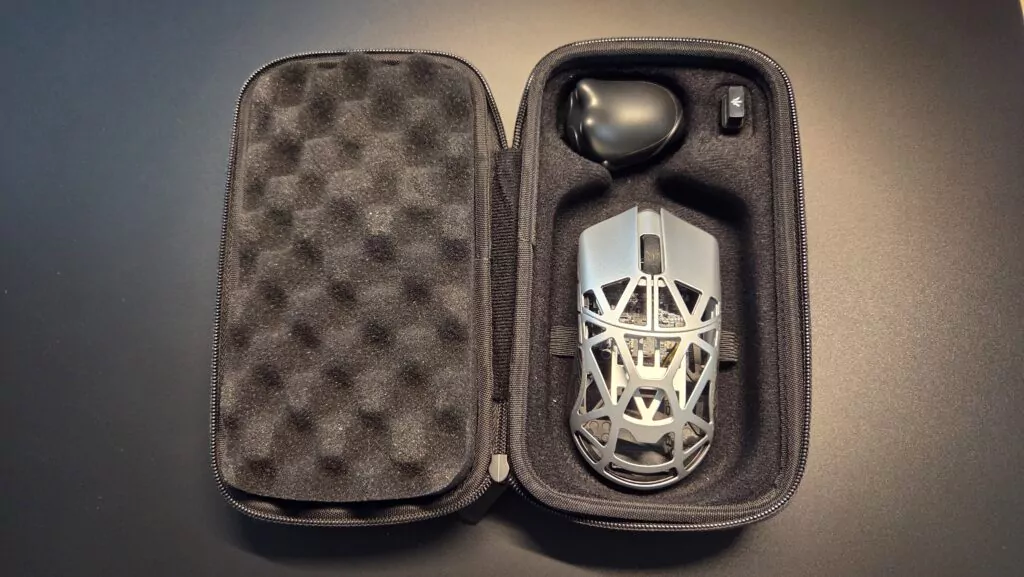 Dès l’ouverture de la boîte, la Wlmouse Beast X Mini Pro 8K se distingue par le soin apporté à la présentation. On y trouve la souris, un dongle sans-fil au design original en forme de chat, un câble USB-C tressé, plusieurs sets de patins (PTFE et verre), des grips autocollants, un manuel, ainsi qu’une petite housse de transport.