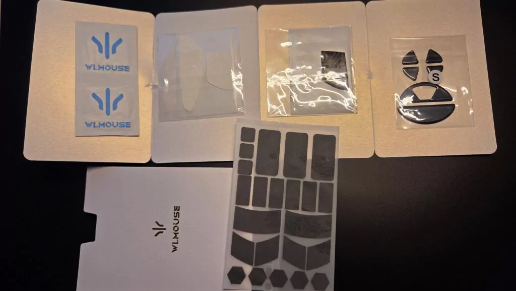 WLMouse inclut un véritable kit d’expérimentation : patins dot skates, corner skates et wide skates, et plusieurs grips prédécoupés. Une rareté dans le secteur, qui fait de cette souris un petit “laboratoire” pour trouver son glide idéal.